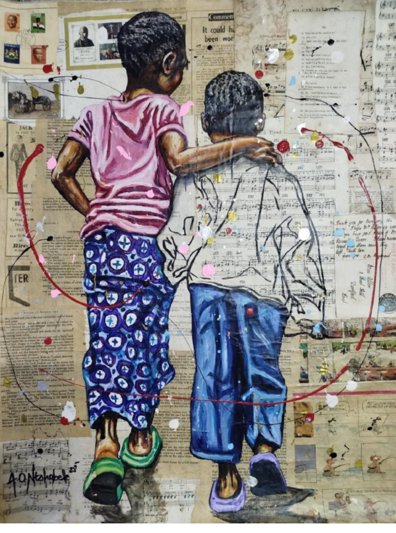 Andrew Ntshabele, born in 1986, lives and works in the inner city of Johannesburg. His art is informed by his environment as he observes the world around him with a critical eye. His mixed-media paintings – a fusion of collage and acrylic – depict what he sees and lives in every day.