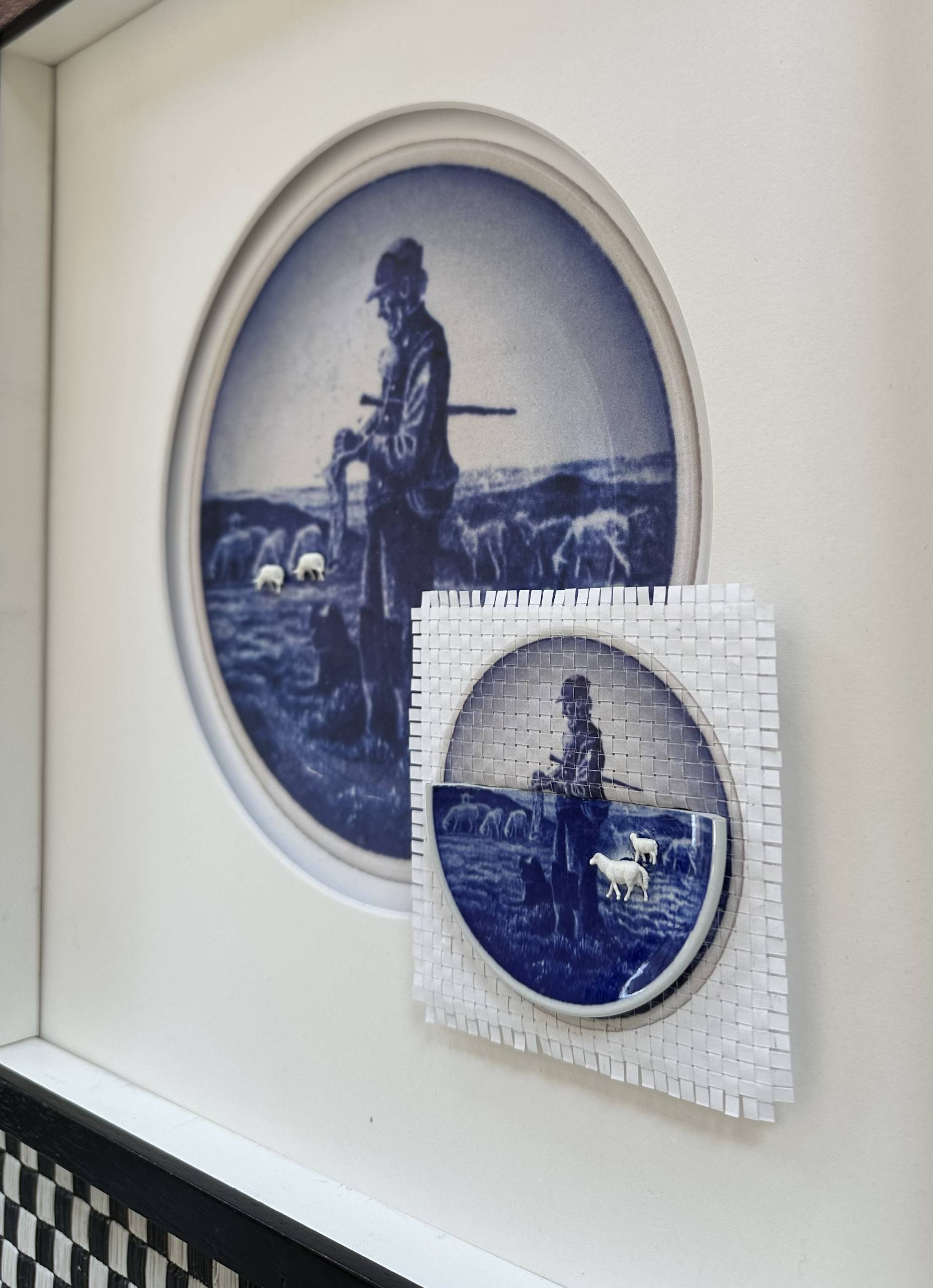 Her compositions often lean toward the surreal, wistful, and contemplative, while retaining a playful edge. Old photographs frequently serve as backdrops, imbuing her work with nostalgia and a sense of tender memory. Paper weaving has become another integral medium in her practice. In this process, Juanita Oosthuizen interlaces images with precision, carefully preserving their recognizability—resulting in woven visuals that are, in her words, “broken but healed.”