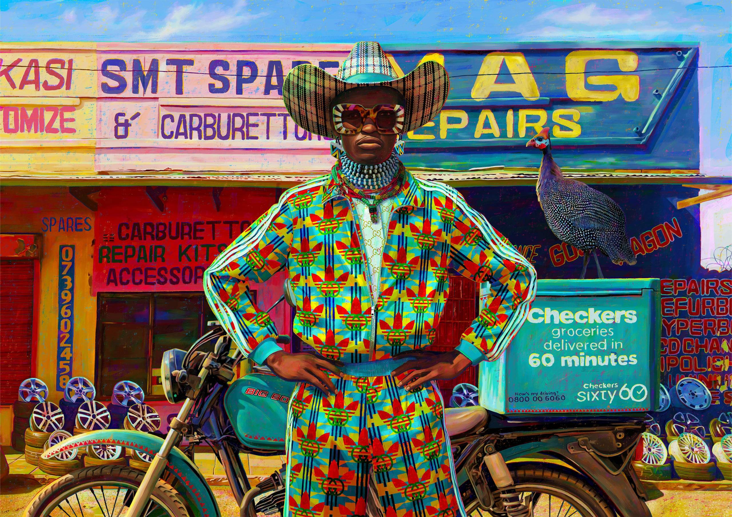 This artwork celebrates the vibrancy, resilience, and ingenuity of everyday life while reflecting the evolving urban culture. Centered on a Checkers Sixty60 delivery rider, the figure is adorned in a bold Adidas tracksuit.