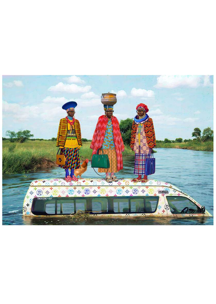 Three women stand defiantly atop a sinking taxi as the river reclaims the streets, a surreal symbol of survival and quiet resistance.