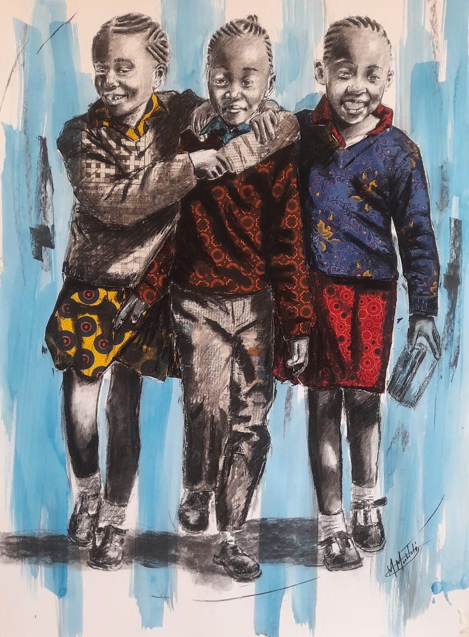 His work is rooted in mixed media, using charcoals, soft pastels, newspaper collage, fabric collage, and acrylic paint. Charcoal allows him to create striking contrasts of light, texture, and composition, while soft pastels infuse his pieces with vibrancy and emotion. The use of newspapers introduces elements of news and storytelling, adding conceptual depth. Traditional fabrics feature prominently, symbolizing identity and expressing personal, cultural, and social connections.