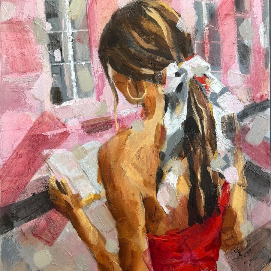 The woman in the painting reflects calm confidence and inner strength—just like the peaceful beauty found in the landscapes of Stellenbosch.