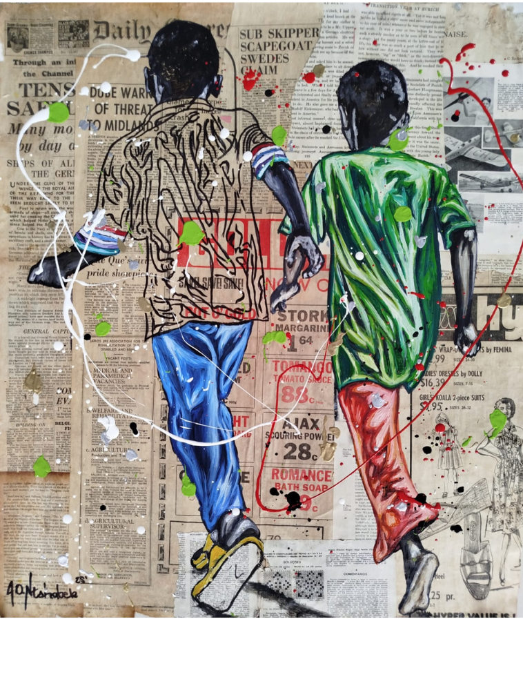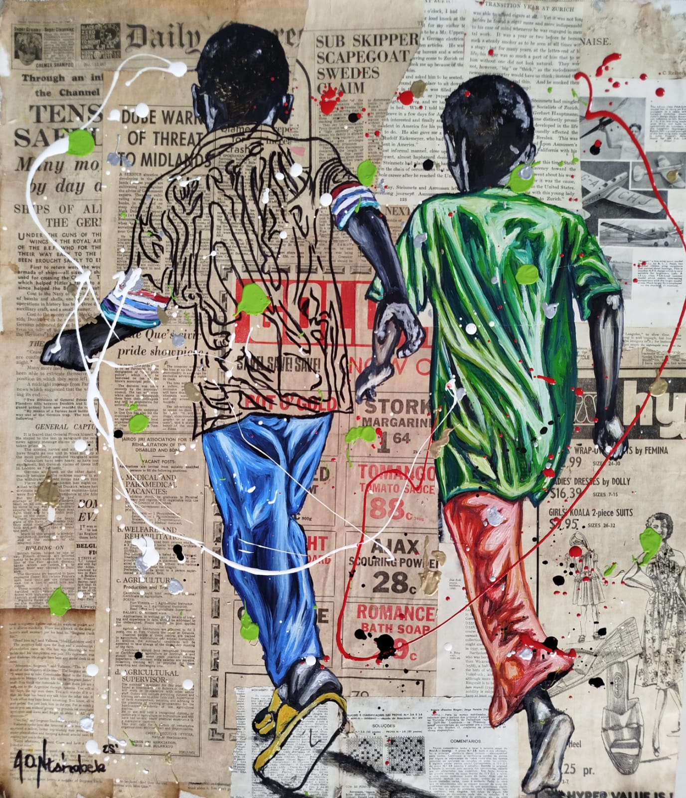 Andrew Ntshabele, born in 1986, lives and works in the inner city of Johannesburg. His art is informed by his environment as he observes the world around him with a critical eye. His mixed-media paintings – a fusion of collage and acrylic – depict what he sees and lives in every day.