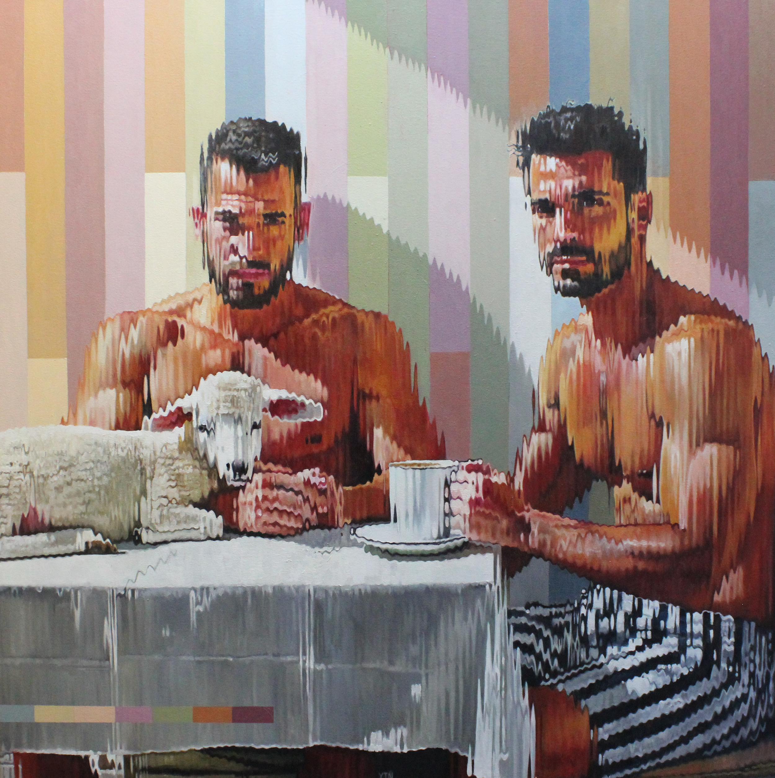 Each artwork begins with a photographic session, after which Eksteen meticulously deconstructs the images into narrow mirrored strips, forming sinusoidal wave patterns reminiscent of light and vibration. His technique balances transparency and opacity, darkness and light, precision and expressive spontaneity. While often minimal in appearance, his paintings carry a striking emotional intensity.