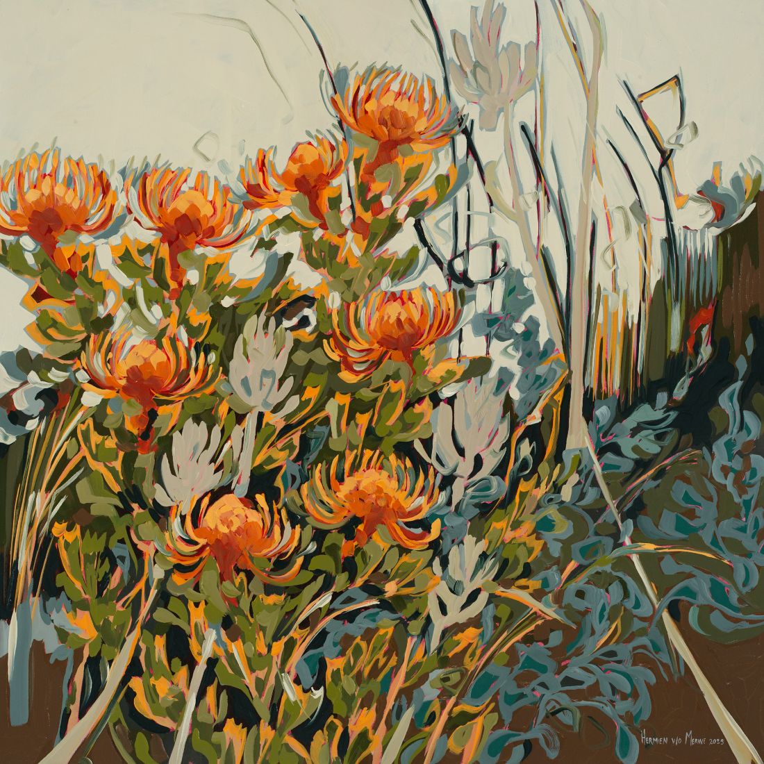 Her paintings explore the effects of fire, wind, rain, and drought on the Cape Fynbos biome. Working intuitively from memory, she translates the landscape’s energy into expressive oil paintings filled with dynamic brushwork and vibrant colour, often on an expansive scale.