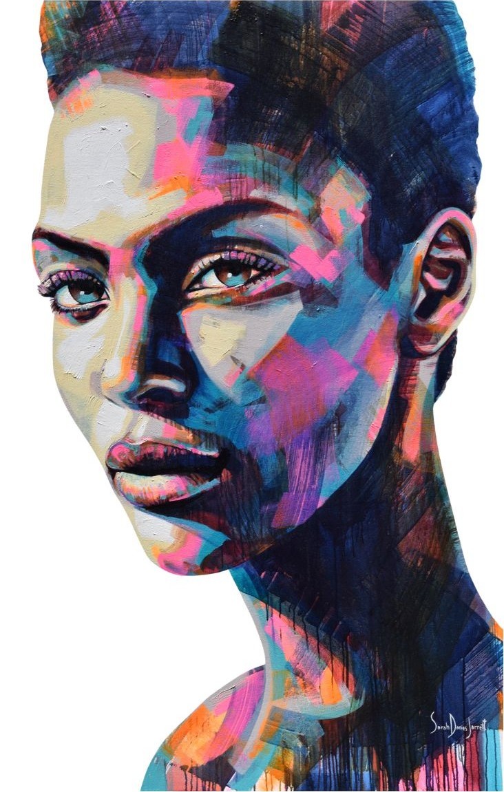 Her unique style is a paradox of chaos and control. Brazen, aggressive brushstrokes collide with soft curves, sharply defined by precise edges. This tension reflects Sarah Danes Jarrett’s own personality—a desire to create order in an ever-changing world. Her work, while bold, bright, and blocky, always maintains a sense of deliberation. White plays a pivotal role in her paintings. She begins with layers of vibrant colour, and then defines the form using white paint, revealing the portrait in its final stages.