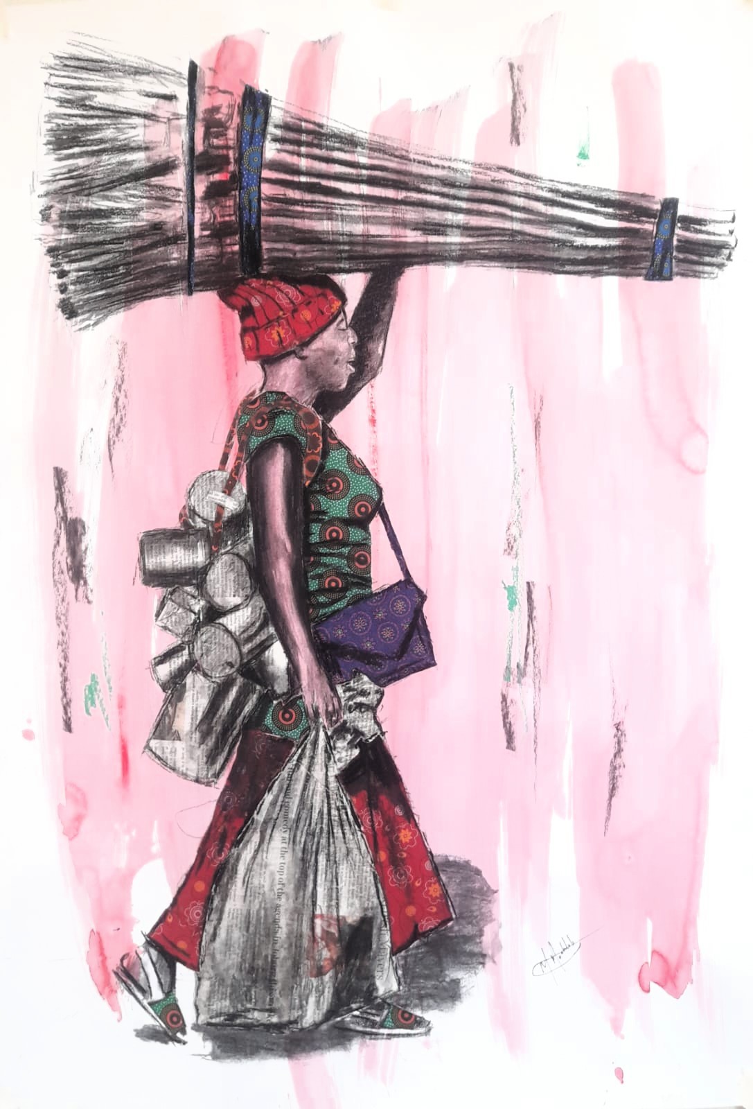 His work is rooted in mixed media, using charcoals, soft pastels, newspaper collage, fabric collage, and acrylic paint. Charcoal allows him to create striking contrasts of light, texture, and composition, while soft pastels infuse his pieces with vibrancy and emotion. The use of newspapers introduces elements of news and storytelling, adding conceptual depth. Traditional fabrics feature prominently, symbolizing identity and expressing personal, cultural, and social connections.