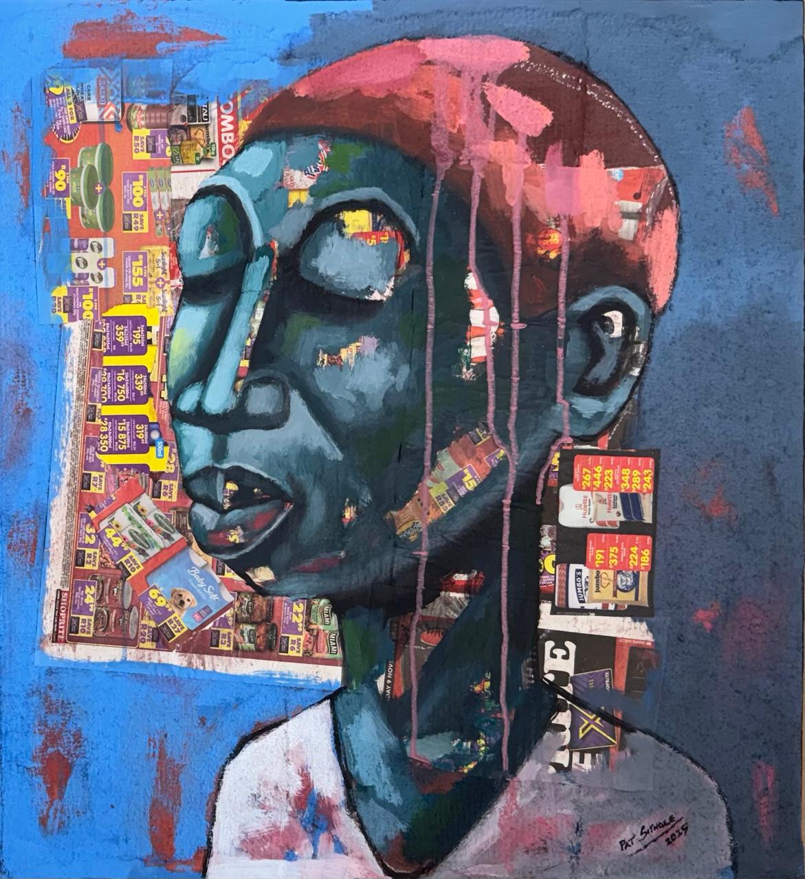 Sithole’s figures evoke emotional reactions and personal expression, yet they are set against a layered backdrop of consumer-culture visuals. Through this juxtaposition he invites viewers to reflect on their own relationship to consumption, prices, and the shifting value of necessities. In his 2025 series, the collages record current price levels, making each work not only an aesthetic object, but a document of socio-economic conditions at a moment in time. In this way, each painting becomes a piece of history: whoever owns it holds a record of lived reality and the cost of survival in that era.