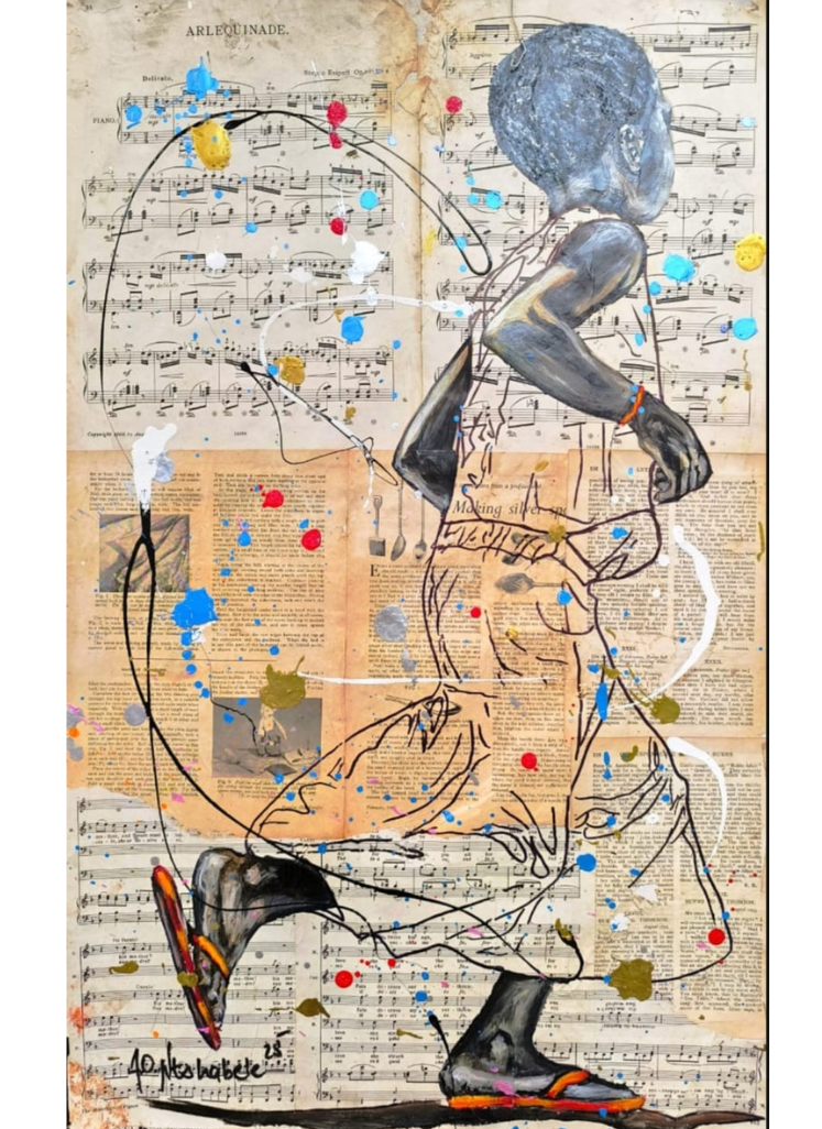 Andrew Ntshabele, born in 1986, lives and works in the inner city of Johannesburg. His art is informed by his environment as he observes the world around him with a critical eye. His mixed-media paintings – a fusion of collage and acrylic – depict what he sees and lives in every day.