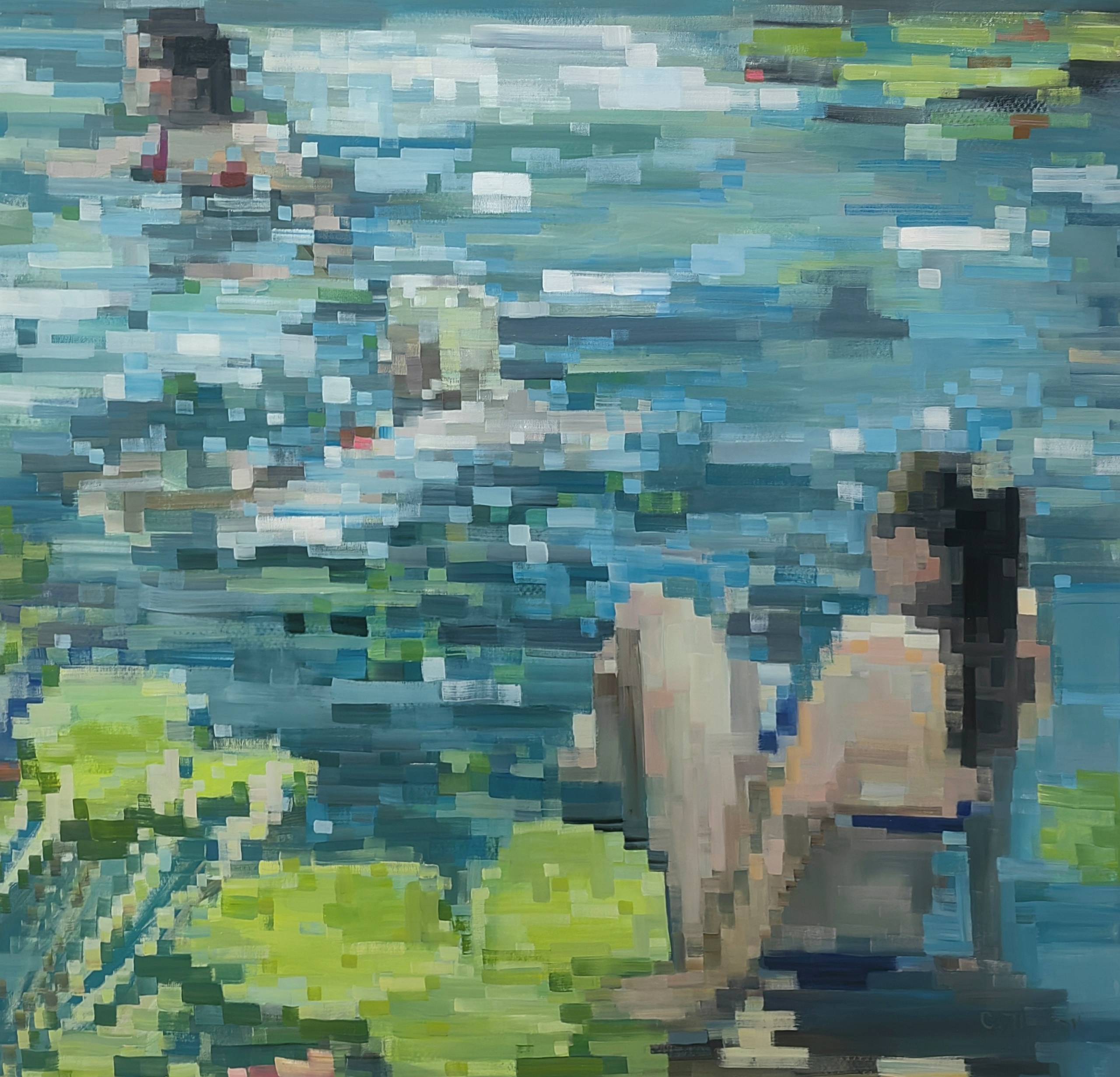 In 2019, Cornè Theron moved to France on a talent visa awarded by the French government to further develop her artistic career. It was during this time, in a farmhouse near Cape Town, that she began experimenting with glass as a medium to pixelate her images. This innovation introduced abstraction and depth to her work, blurring the boundaries between reality and perception. In her practice, pixels are not merely aesthetic elements—they symbolize individuality within a collective, echoing the human experience within society.