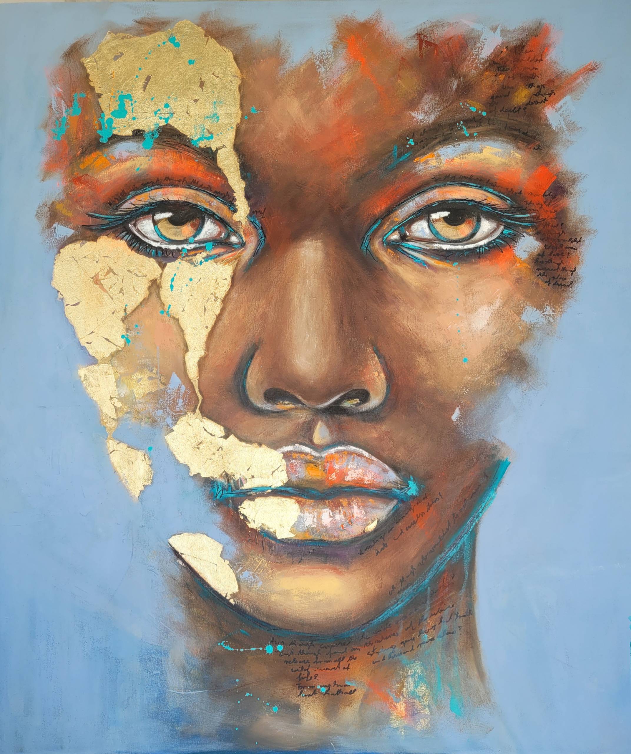 The painting “Queen of Swords” is inspired by the Tarot card of the same name. The Tarot, rooted in ancient mysticism and the Kabbalah, explores The painting “What Once Was Broken II” is inspired by the Japanese art of Kintsugi, where broken pieces are repaired with gold. This ancient craft celebrates imperfection, turning cracks into luminous lines that tell a story of healing and transformation.