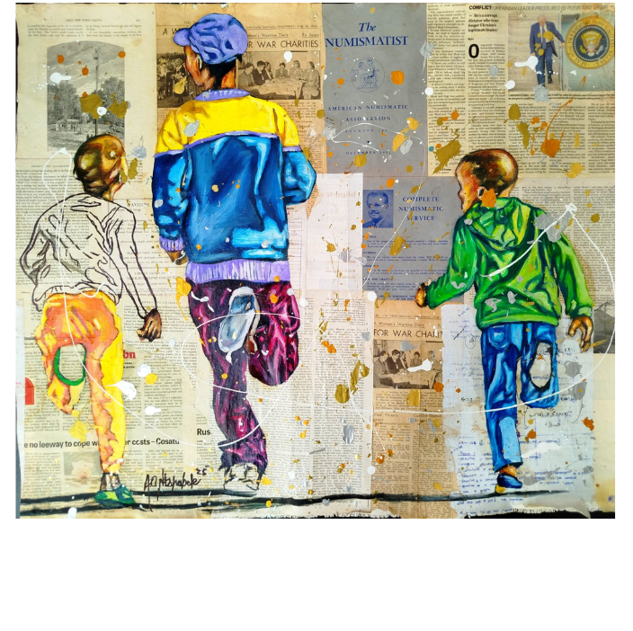 Andrew Ntshabele, born in 1986, lives and works in the inner city of Johannesburg. His art is informed by his environment as he observes the world around him with a critical eye. His mixed-media paintings – a fusion of collage and acrylic – depict what he sees and lives in every day.