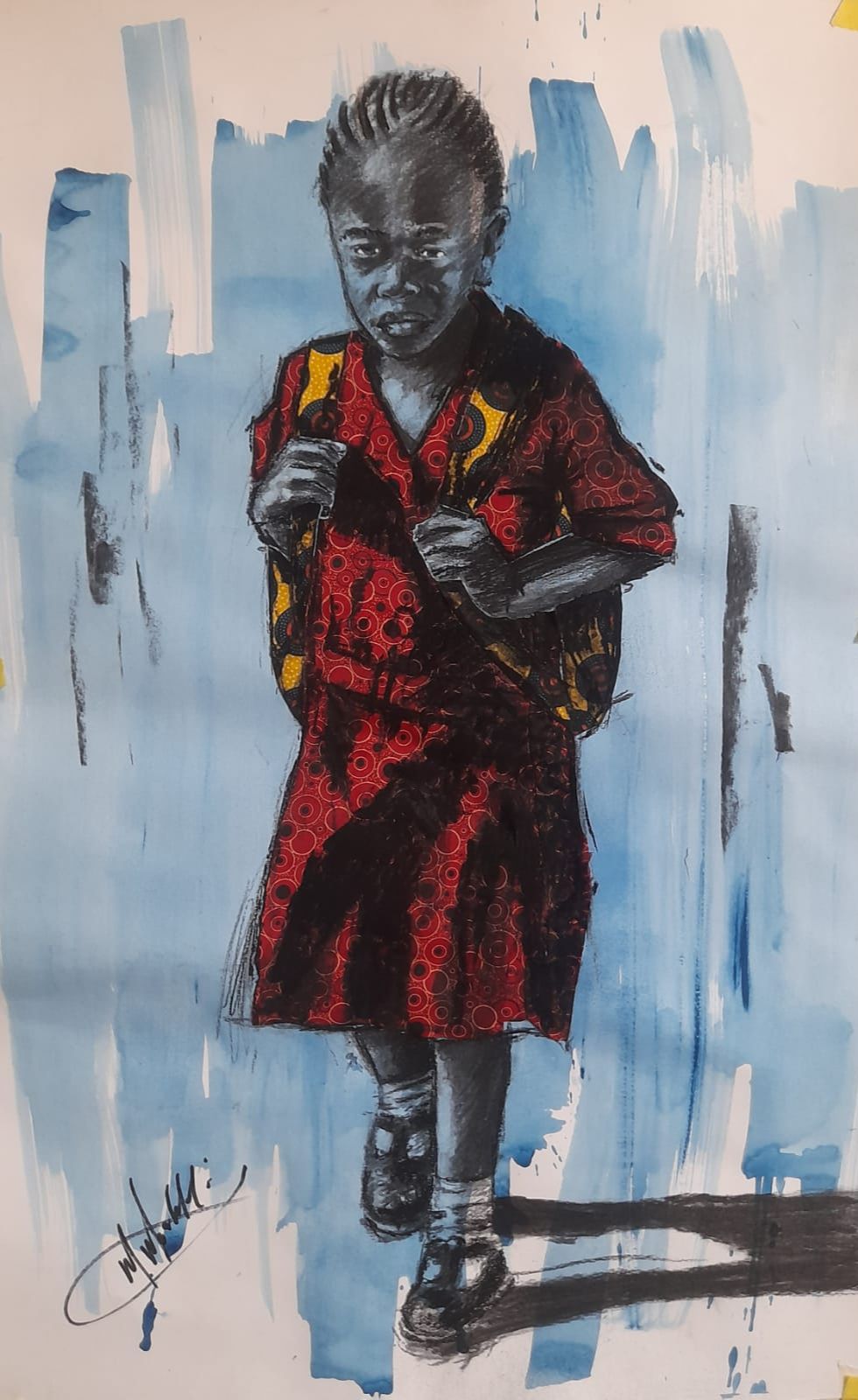 Working primarily in mixed media, including charcoal, soft pastels, newspaper and fabric collage, and acrylic paint, Moahloli creates layered works rich in texture and meaning. His use of traditional fabrics symbolizes identity and cultural connection, while newspaper elements introduce storytelling and social commentary. Rooted in everyday life in Soweto, his art celebrates the people and cultural diversity that shape his community.